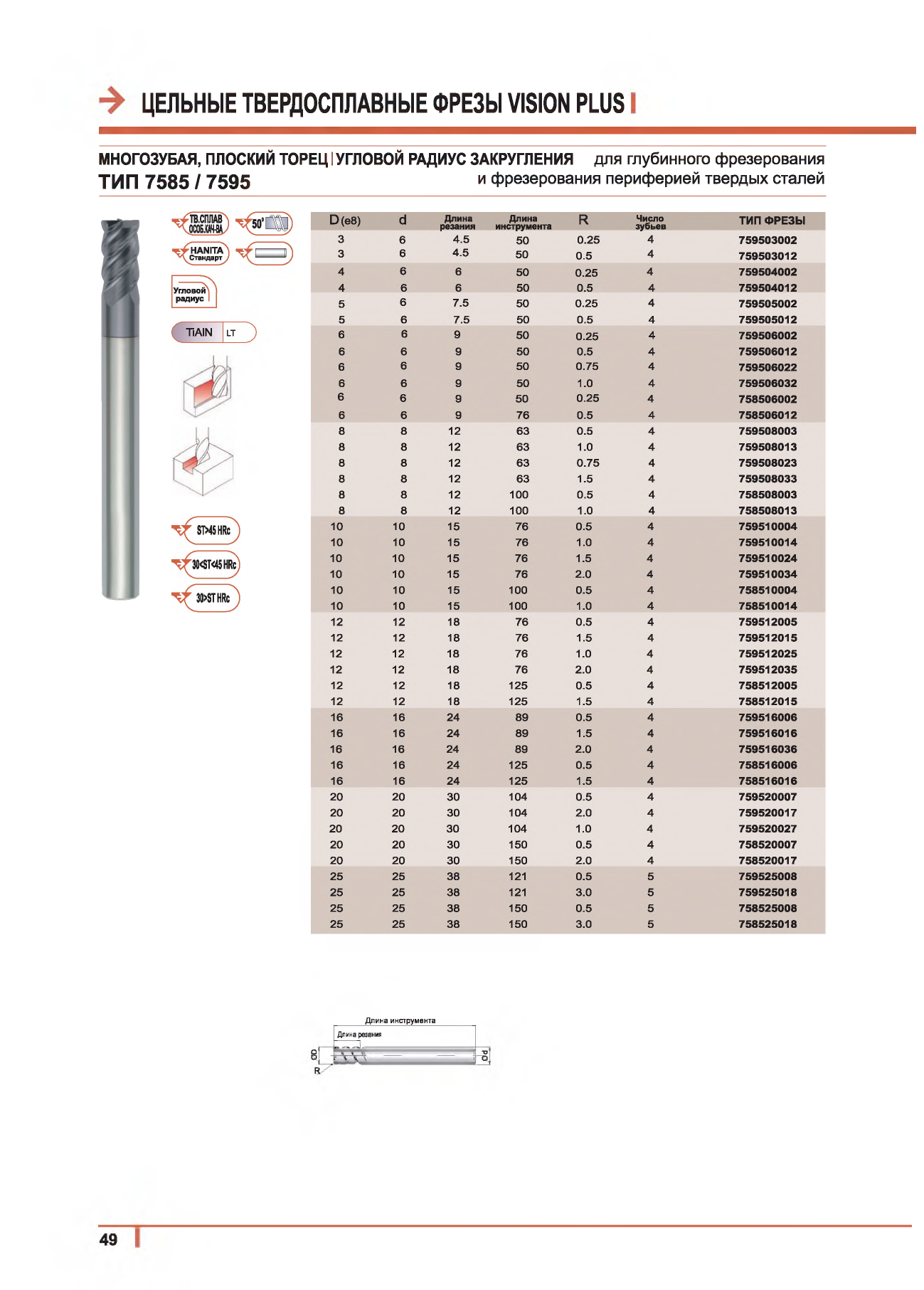 МНОГОЗУБАЯ, ПЛОСКИЙ ТОРЕЦ IУГЛОВОЙ РАДИУС ЗАКРУГЛЕНИЯ д л я глубинного ф резерования